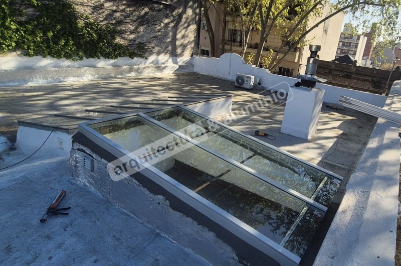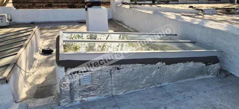 Se realizó un cambio en casa antigüa de claraboya fija con estructura en ALUMINIO GRIS NATURAL con vidrio Laminado de 4+4. Se le incorporó celosías para ventilación con malla adosada (ver foto del antes y el después)