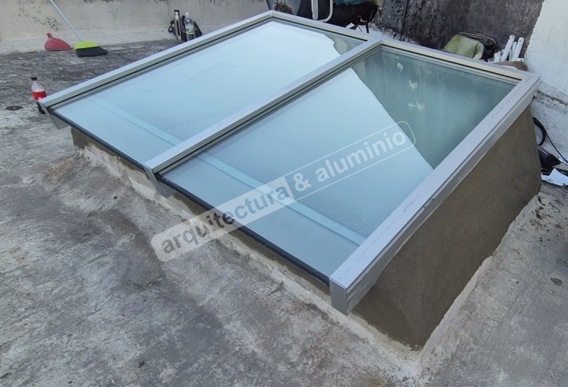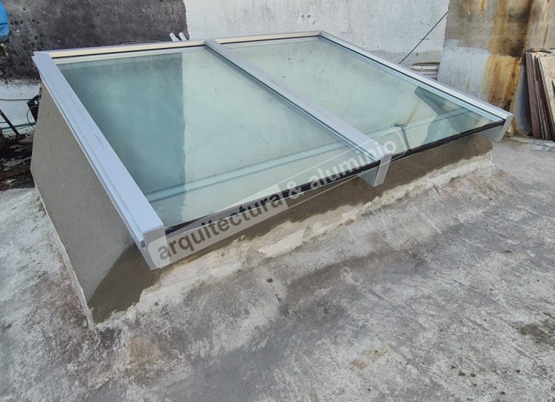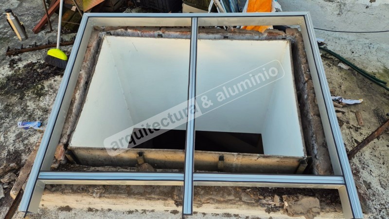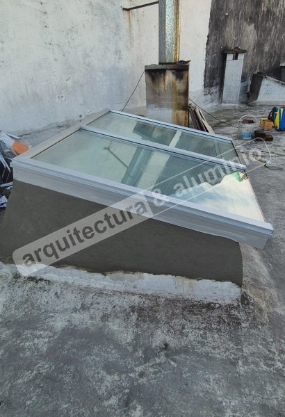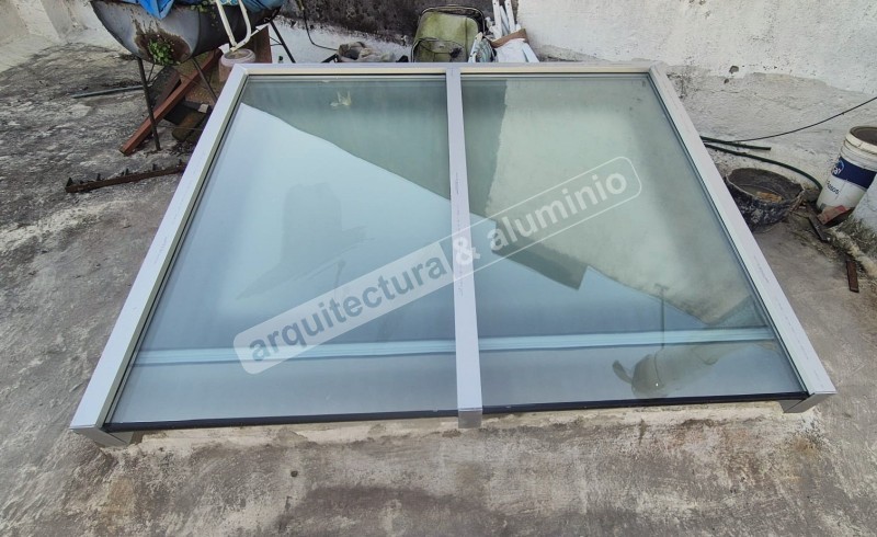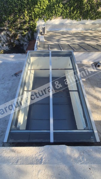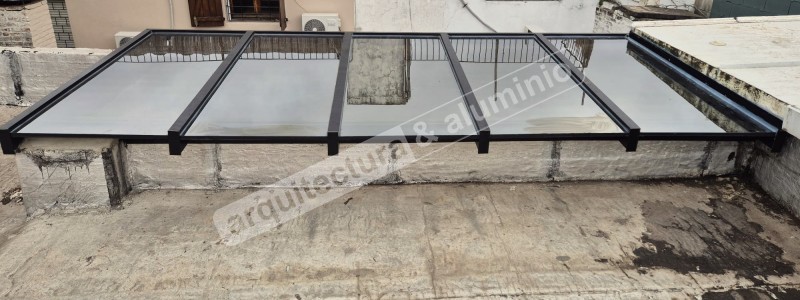 Estructura en ALUMINIO GRIS NATURAL Vidrio DVH ( laminado + cámara + templado) Se agregó lámina arenada Terminación con Alero Ver el antes (foto 2 y 3), durante(foto 4) y el después#386 Claraboya con motor Punta Gorda