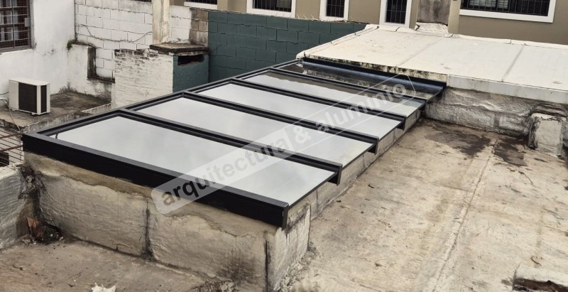 Se realizaron claraboyas con DVH - vidrio especial en aluminio anodizado gris natural. FIJAS con DVH cara templada con Low-e más cara laminada. Se incluyó Tabaquera (ventana) con apertura de motor.#376 Puerta de acceso de edificio Centro