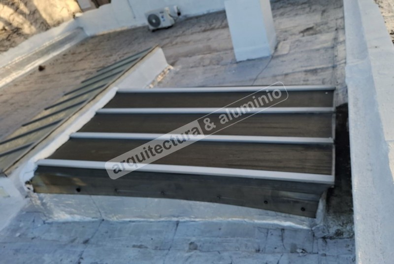 Se realizó en Aluminio anodizado gris natural. Combinado con abertura corrediza con fijo. Se realizó perforación en fijo para pasar caño. Complementado con celosía. Todo colocado.#291 Claraboyas Pocitos