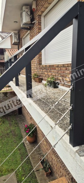 ALEROS con estructura en aluminio gris natural. Se completa con vidrio laminado. Se realizaron de diferentes medidas, colocados. - Alero 1, medidas 110 x 75. - Alero 2, medidas 140 x 75.#367 Baranda de tubos Montevideo