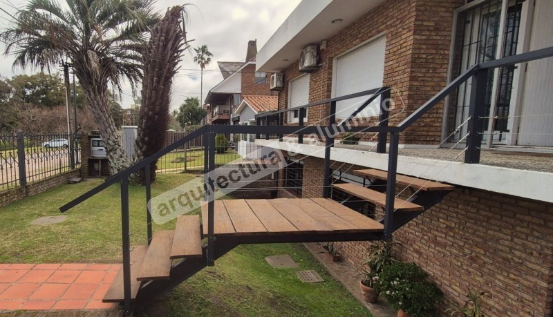 Obra completa en Madonado, cuenta con aberturas integradas, con cortina y cajón todo aluminio; terminación ANOLOCK en aluminio color marrón oscuro casi negro. Ventanas corredizas, fijas, algunas en aluminio color blanco. Cuenta con dos puertas batientes en estilo de tablillas.#6 Cerramiento de porche Sayago